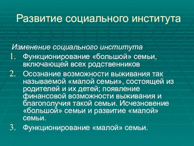 выживания так называемой «малой семьи», состоящей из родителей и их детей; появление финансовой возможности выживания и благополучия такой семьи. Исчезновение «большой» семьи и развитие «малой» семьи.