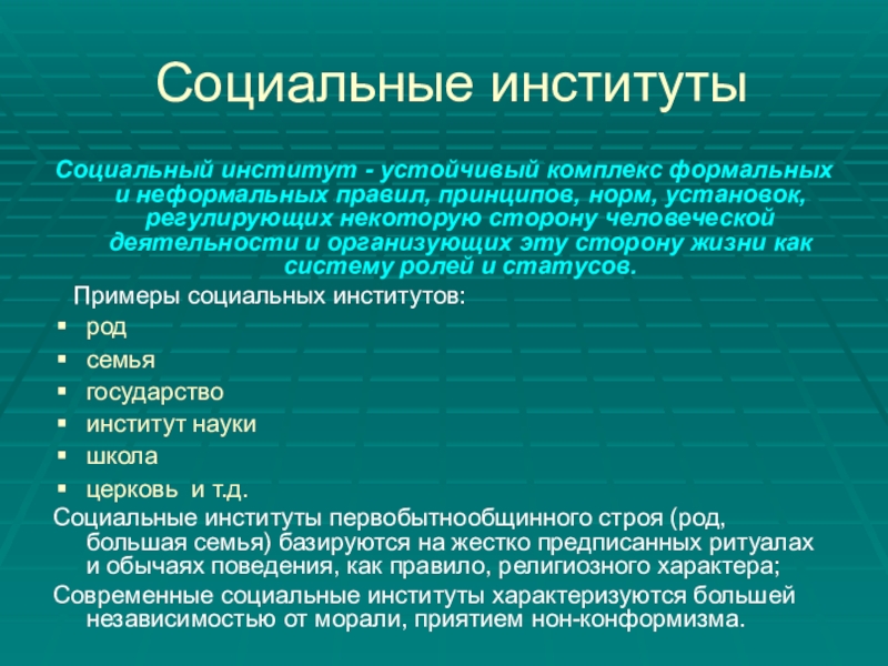 Социальный институт - устойчивый комплекс формальных и неформальных правил, принципов,