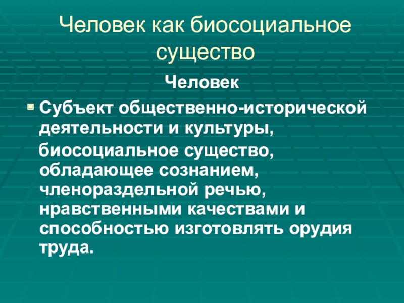 обладающее сознанием, членораздельной речью, нравственными качествами и способностью изготовлять орудия труда.