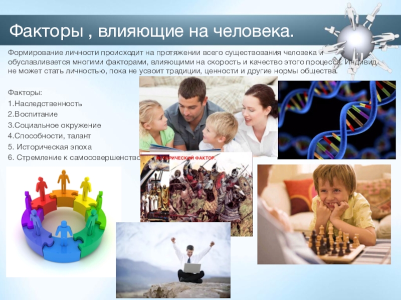 Факторы , влияющие на человека.  Формирование личности происходит на протяжении всего существования человека и обуславливается