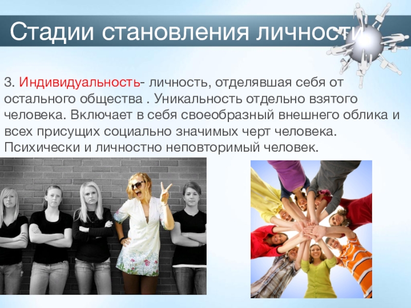 Стадии становления личности3. Индивидуальность- личность, отделявшая себя от остального общества . Уникальность отдельно взятого человека. Включает в