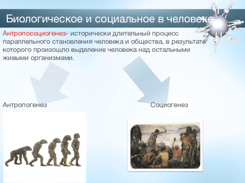 Биологическое и социальное в человекеАнтропосоциогенез- исторически длительный процесс параллельного становления человека и общества, в результате которого произошло