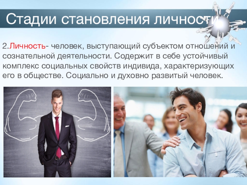 Стадии становления личности2.Личность- человек, выступающий субъектом отношений и сознательной деятельности. Содержит в себе устойчивый комплекс социальных свойств