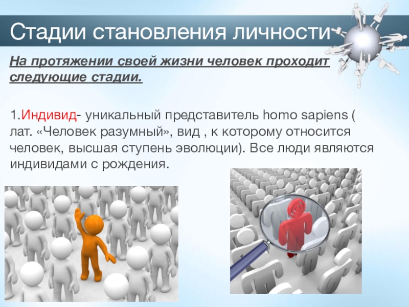 Стадии становления личностиНа протяжении своей жизни человек проходит следующие стадии.  1.Индивид- уникальный представитель homo sapiens (