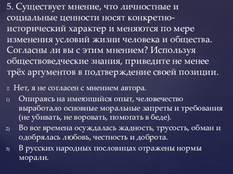 5. Существует мнение, что личностные и социальные ценности носят конкретно-исторический характер и меняются по мере изменения условий жизни человека и общества. Согласны ли вы с этим мнением? Используя обществоведческие знания, приведите не менее трёх аргументов в подтверждение своей позиции.