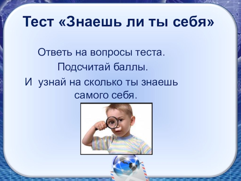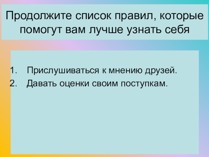 Слайд 18Продолжите список правил, которые помогут вам лучше узнать себя