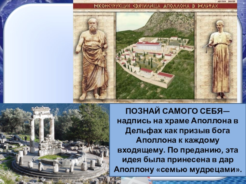 бога Аполлона к каждому входящему. По преданию, эта идея была принесена в дар Аполлону «семью мудрецами».