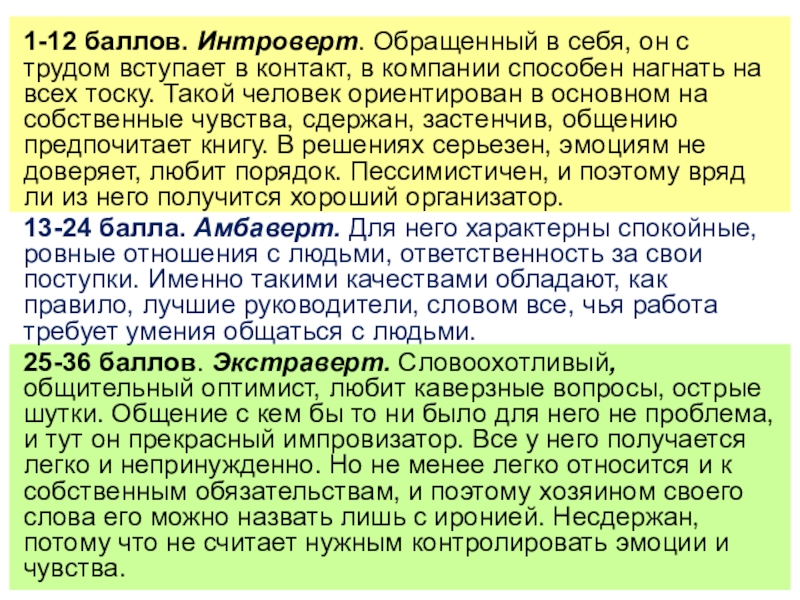 13-24 балла. Амбаверт. Для него характерны спокойные, ровные отношения с людьми, ответственность за свои поступки. Именно такими качествами обладают, как правило, лучшие руководители, словом все, чья работа требует умения общаться с людьми.