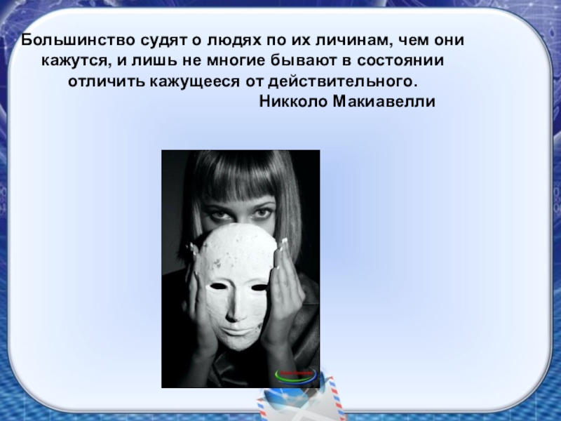 Слайд 5Большинство судят о людях по их личинам, чем они кажутся, и