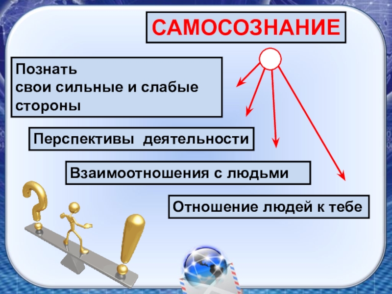 и возможностей, поиск того вида деятельности, который будет им соответствовать и помогать ему реализоваться как личность. Осознавая свои способности, качества своей личности, человек стремится что-то изменить в своих отношениях с окружающими.