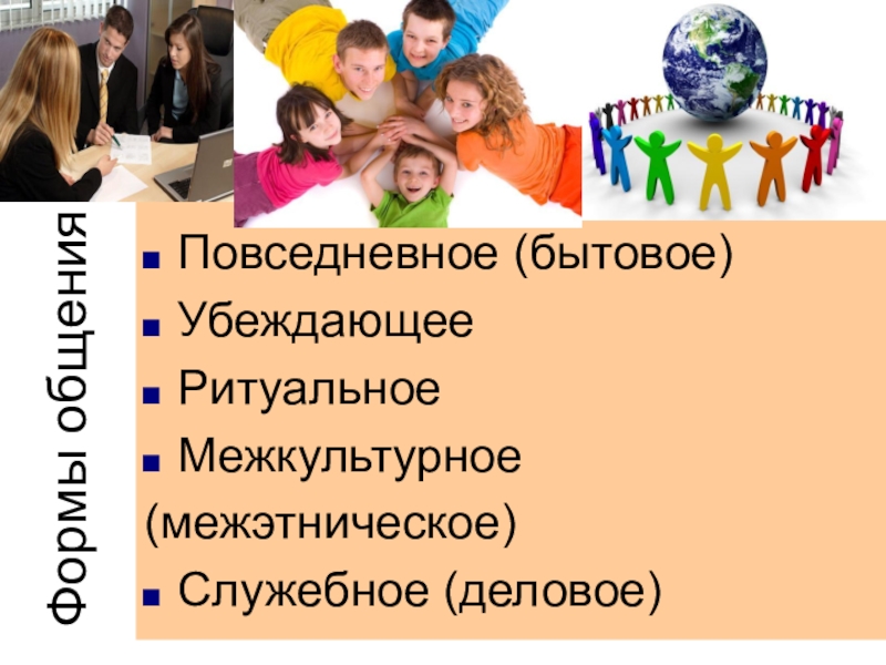 Формы общенияПовседневное (бытовое)УбеждающееРитуальноеМежкультурное(межэтническое)Служебное (деловое)