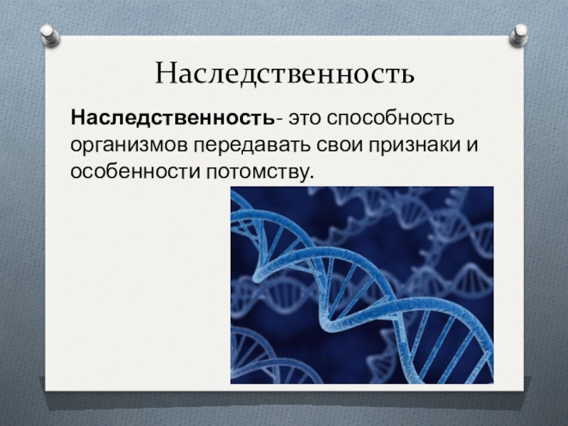 НаследственностьНаследственность- это способность организмов передавать свои признаки и особенности потомству.