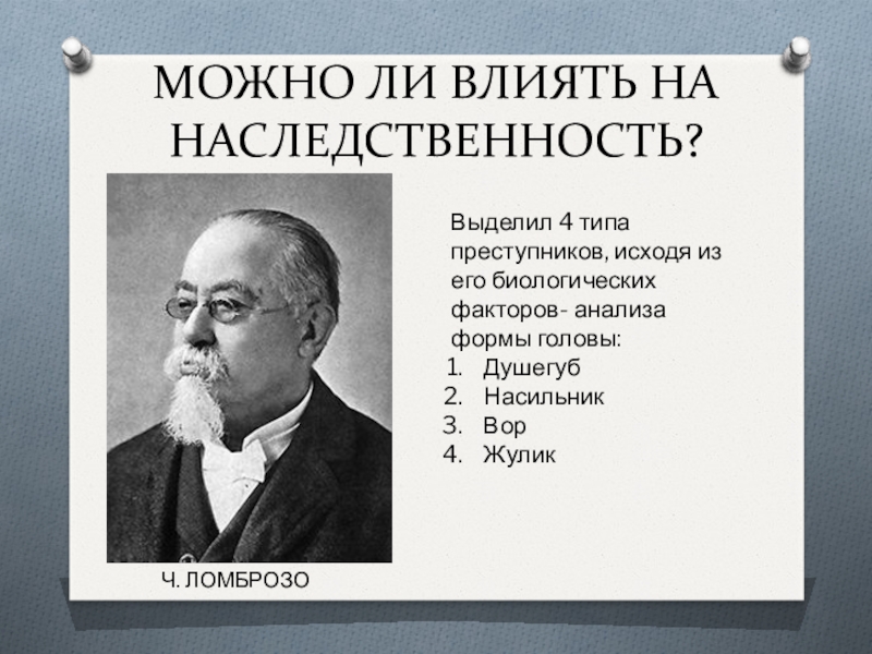 МОЖНО ЛИ ВЛИЯТЬ НА НАСЛЕДСТВЕННОСТЬ?Ч. ЛОМБРОЗОВыделил 4 типа преступников, исходя из его биологических факторов- анализа формы головы:ДушегубНасильникВорЖулик