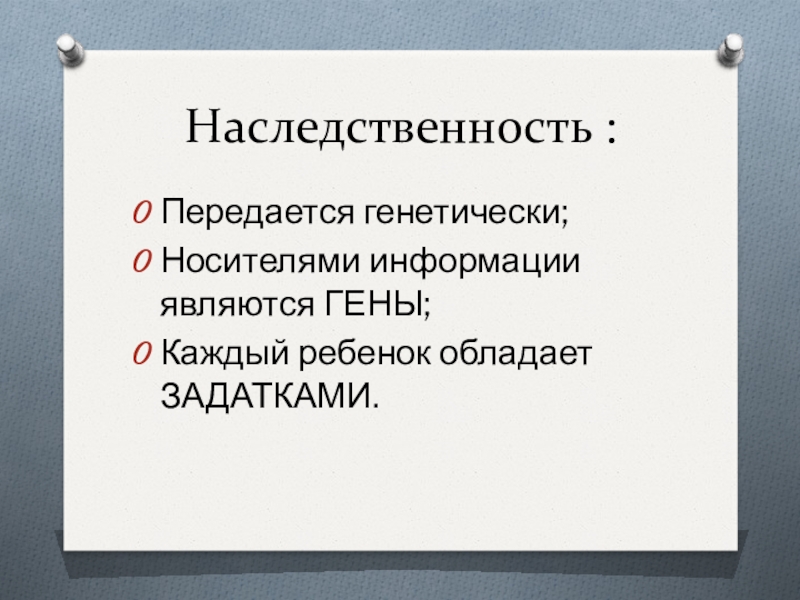 Наследственность :Передается генетически;Носителями информации являются ГЕНЫ;Каждый ребенок обладает ЗАДАТКАМИ.