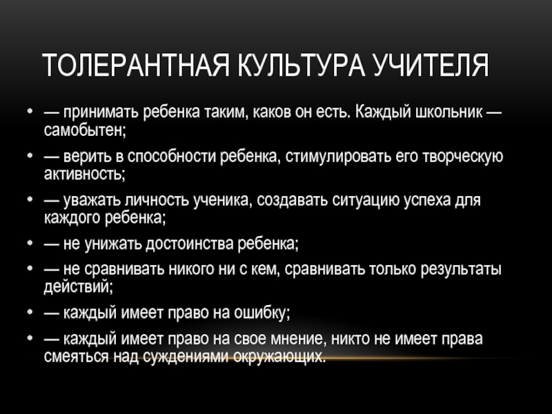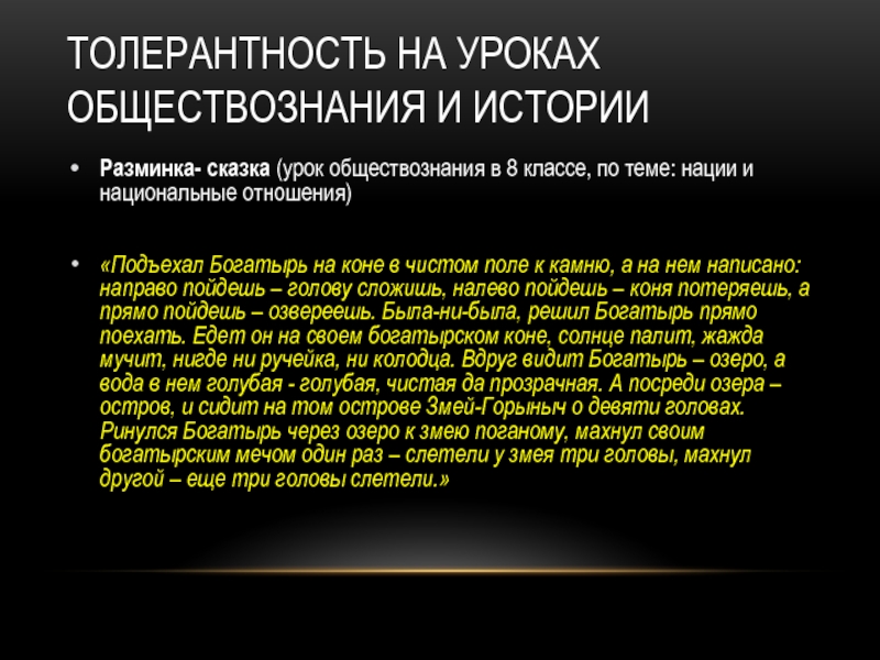 Толерантность на уроке должна проявляться в том, что для учащихся не должно быть никаких запретных для обсуждения тем или вопросов, каждое мнение, если оно является обоснованным, имеет право быть выслушанным и обсуждённым.