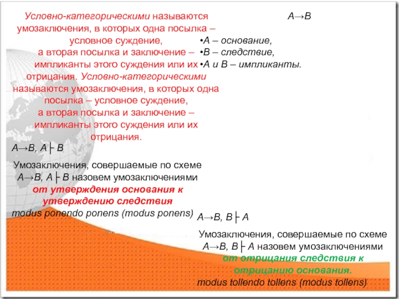 Умозаключения, совершаемые по схеме А→В, А├ В назовем умозаключениями