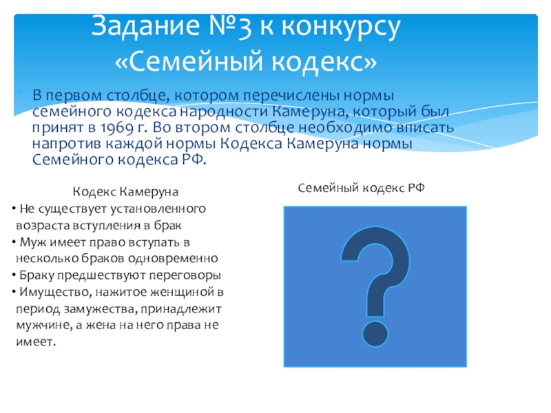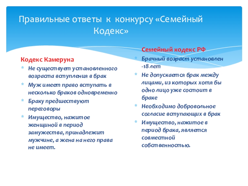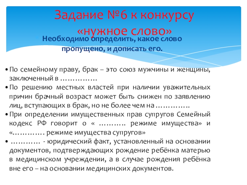 По семейному праву, брак – это союз мужчины и женщины, заключенный в ……………