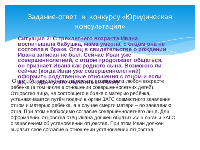 Ответ. Установление отцовства возможно в любом возрасте ребёнка (в том числе в отношении совершеннолетних детей). Отцовство лица, не состоящего в браке с матерью ребёнка, устанавливается путём подачи в орган ЗАГС совместного заявления отцом и матерью ребёнка, а в случае смерти матери – по заявлению отца. При этом необходимо согласие совершеннолетнего лица. Для оформления отцовства отец Ивана должен обратиться в органы ЗАГС с заявлением об установлении отцовства. При этом Иван должен выразит своё согласие в отношении установления отцовства.