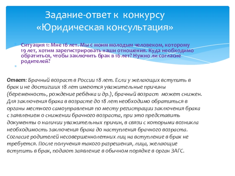 Ответ: Брачный возраст в России 18 лет. Если у желающих вступить в брак и не достигших 18 лет имеются уважительные причины (беременность, рождение ребёнка и др.), брачный возраст может снижен. Для заключения брака в возрасте до 18 лет необходимо обратиться в органы местного самоуправления по месту регистрации заключения брака с заявлением о снижении брачного возраста, при это представить документы о наличии уважительных причин, в связи с которыми возникла необходимость заключения брака до наступления брачного возраста. Согласие родителей несовершеннолетних лиц на вступление в брак не требуется. После получения такого разрешения, лица, желающие вступить в брак, подают заявление в обычном порядке в орган ЗАГС.