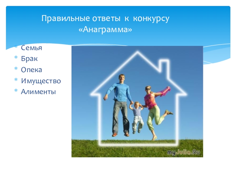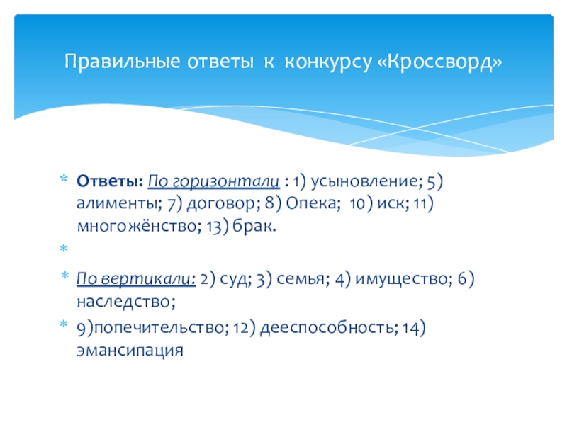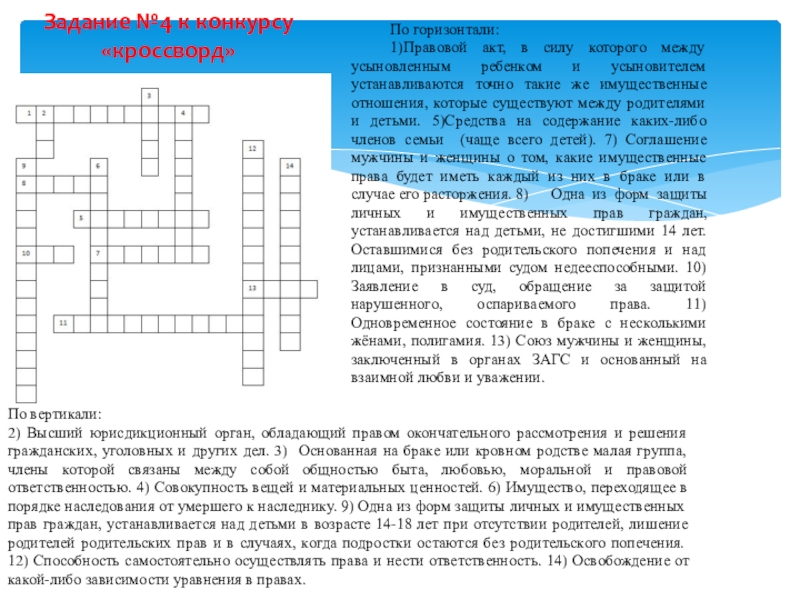 2) Высший юрисдикционный орган, обладающий правом окончательного рассмотрения и решения гражданских, уголовных и других дел. 3) Основанная на браке или кровном родстве малая группа, члены которой связаны между собой общностью быта, любовью, моральной и правовой ответственностью. 4) Совокупность вещей и материальных ценностей. 6) Имущество, переходящее в порядке наследования от умершего к наследнику. 9) Одна из форм защиты личных и имущественных прав граждан, устанавливается над детьми в возрасте 14-18 лет при отсутствии родителей, лишение родителей родительских прав и в случаях, когда подростки остаются без родительского попечения. 12) Способность самостоятельно осуществлять права и нести ответственность. 14) Освобождение от какой-либо зависимости уравнения в правах.