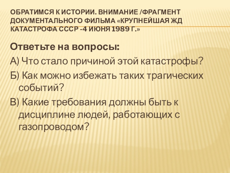 В) Какие требования должны быть к дисциплине людей, работающих с газопроводом?