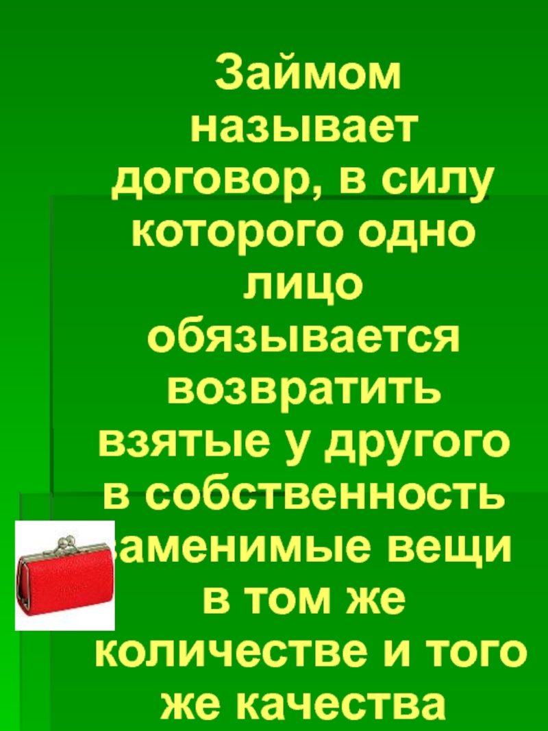 Слайд 2 Займом называет договор, в силу которого одно лицо обязывается возвратить взятые