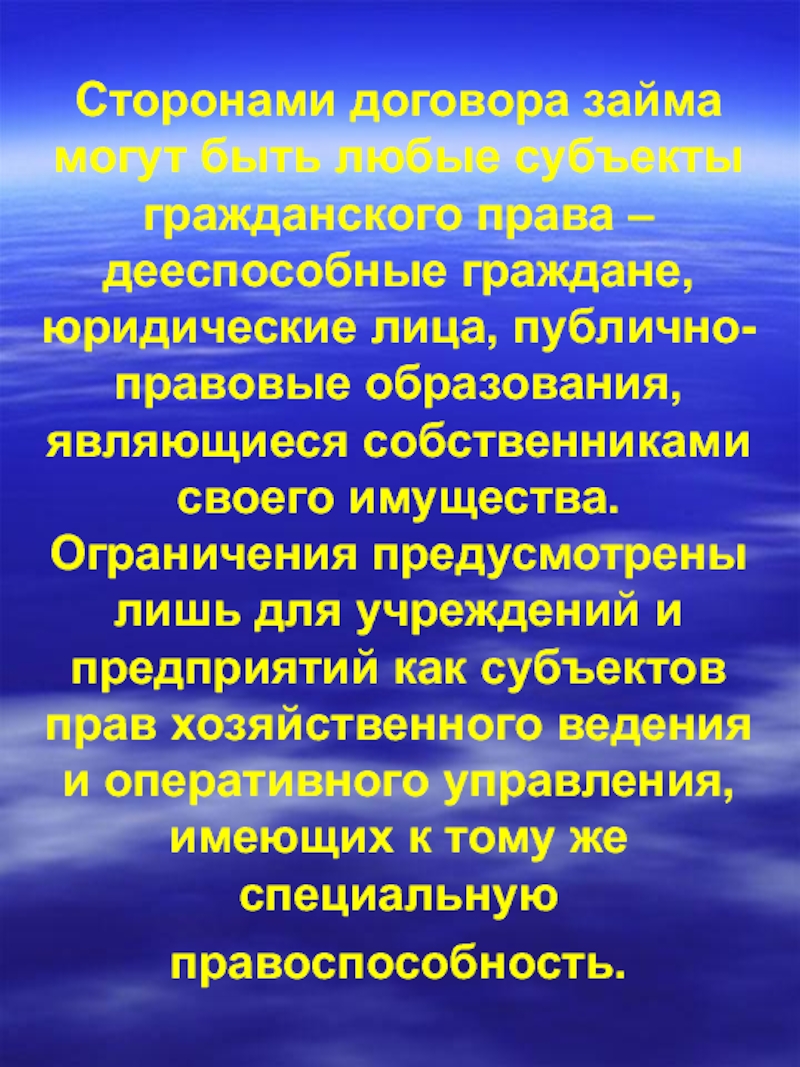 Слайд 3Сторонами договора займа могут быть любые субъекты гражданского права – дееспособные