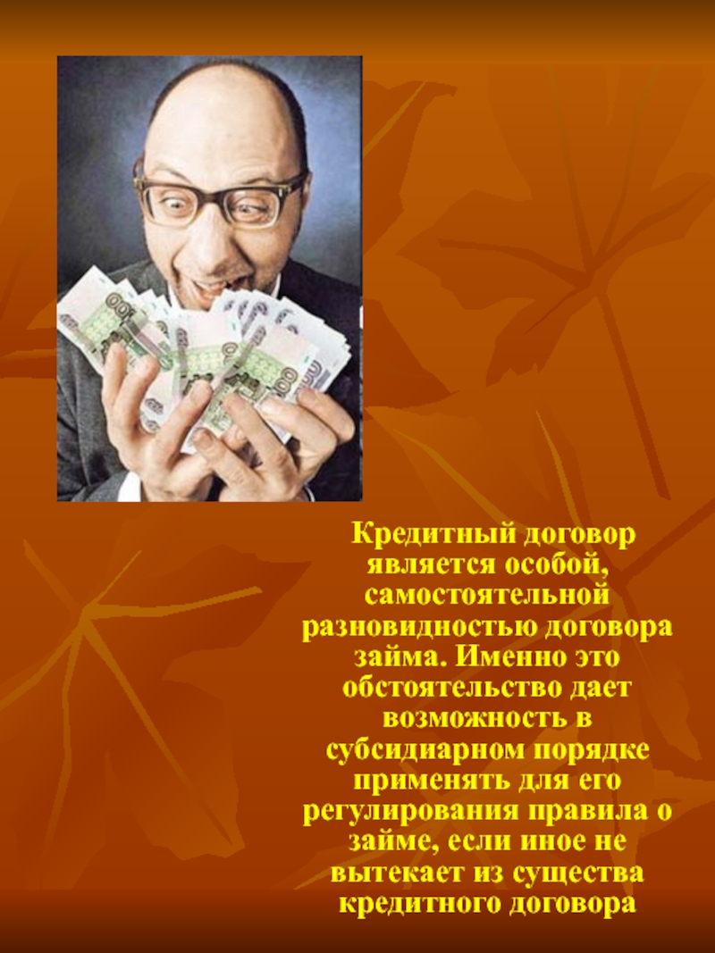 Слайд 4 Кредитный договор является особой, самостоятельной разновидностью договора займа. Именно это обстоятельство