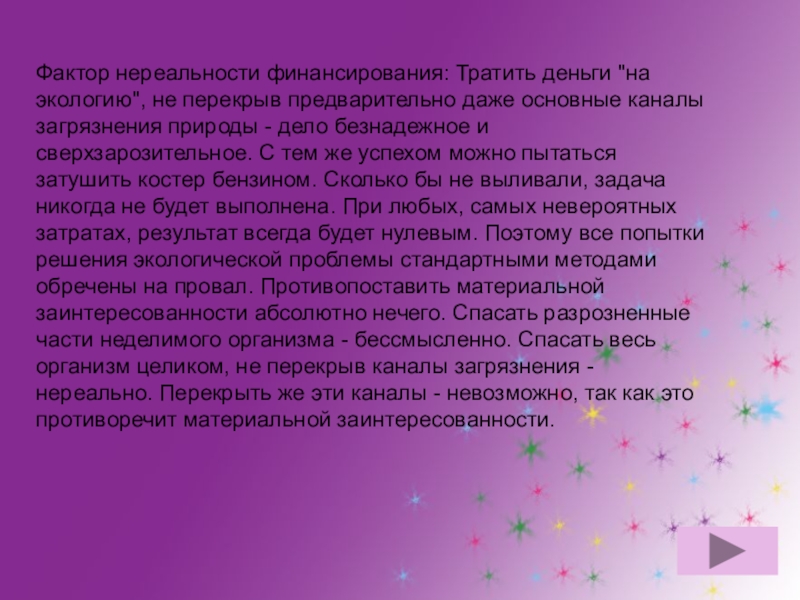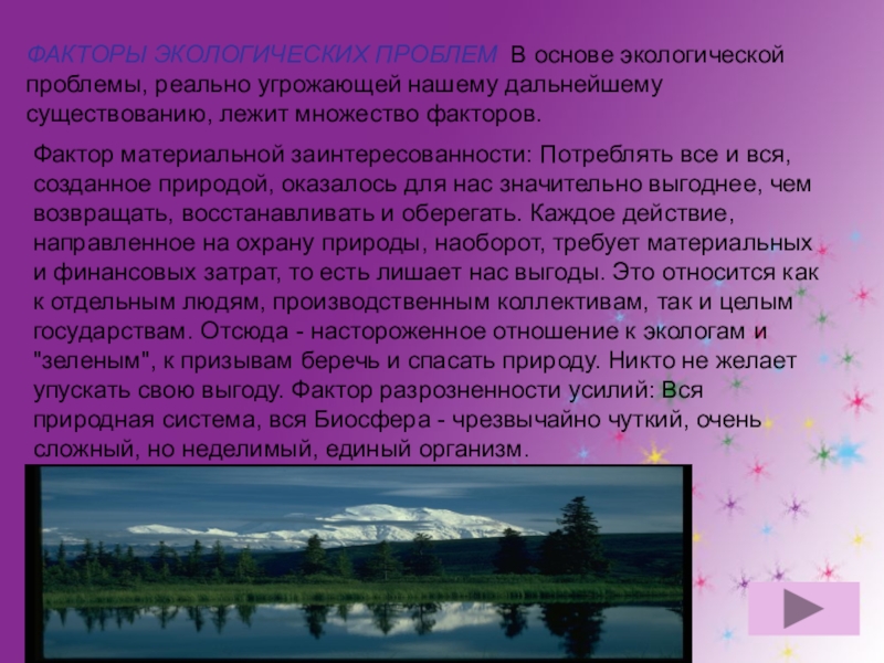 Фактор материальной заинтересованности: Потреблять все и вся, созданное природой, оказалось для нас значительно выгоднее, чем возвращать, восстанавливать и оберегать. Каждое действие, направленное на охрану природы, наоборот, требует материальных и финансовых затрат, то есть лишает нас выгоды. Это относится как к отдельным людям, производственным коллективам, так и целым государствам. Отсюда - настороженное отношение к экологам и "зеленым", к призывам беречь и спасать природу. Никто не желает упускать свою выгоду. Фактор разрозненности усилий: Вся природная система, вся Биосфера - чрезвычайно чуткий, очень сложный, но неделимый, единый организм.