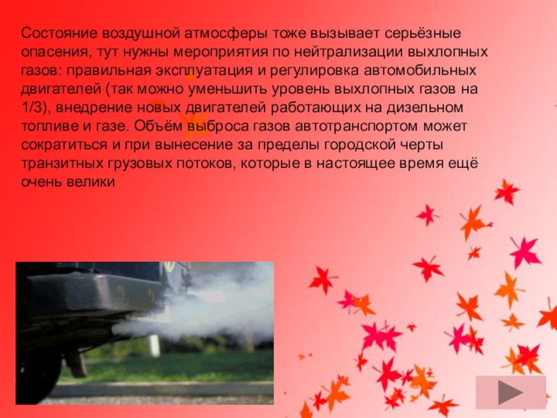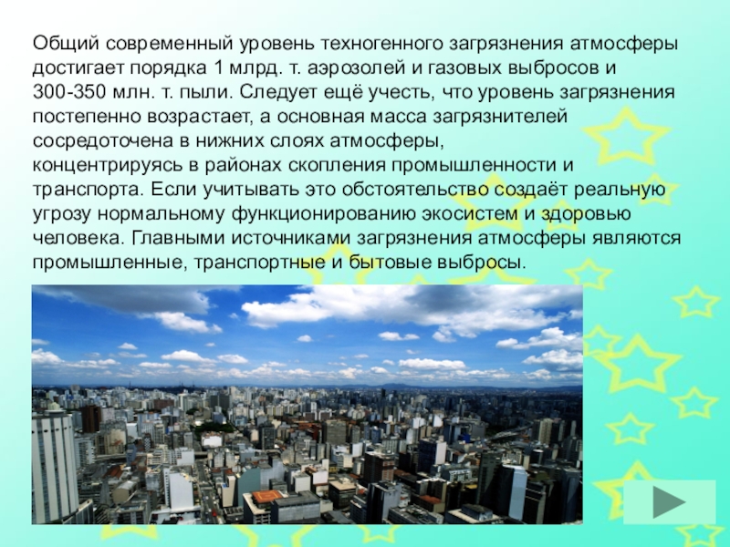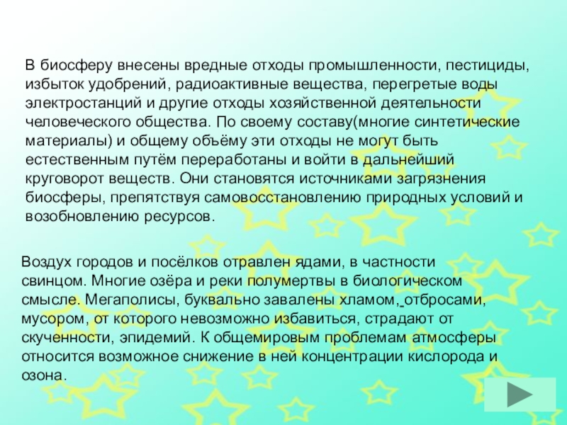 свинцом. Многие озёра и реки полумертвы в биологическом смысле. Мегаполисы, буквально завалены хламом, отбросами, мусором, от которого невозможно избавиться, страдают от скученности, эпидемий. К общемировым проблемам атмосферы относится возможное снижение в ней концентрации кислорода и озона.