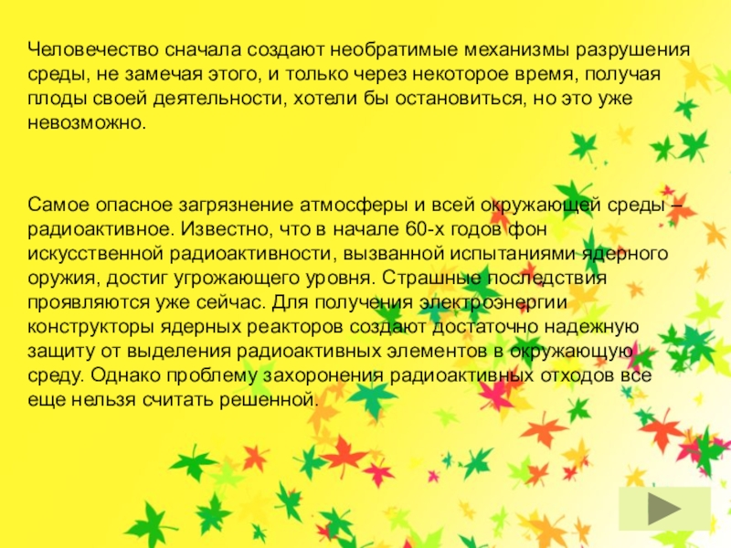 радиоактивное. Известно, что в начале 60-х годов фон искусственной радиоактивности, вызванной испытаниями ядерного оружия, достиг угрожающего уровня. Страшные последствия проявляются уже сейчас. Для получения электроэнергии конструкторы ядерных реакторов создают достаточно надежную защиту от выделения радиоактивных элементов в окружающую среду. Однако проблему захоронения радиоактивных отходов все еще нельзя считать решенной.