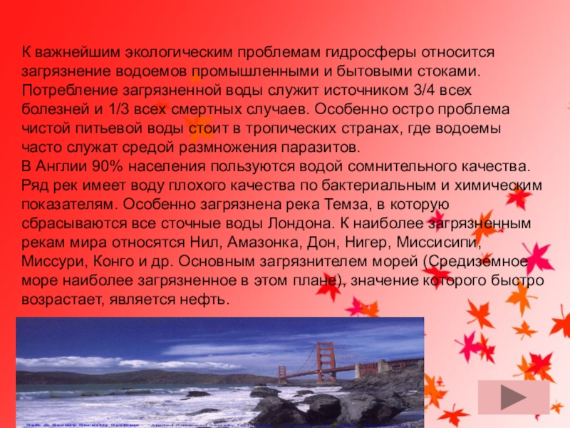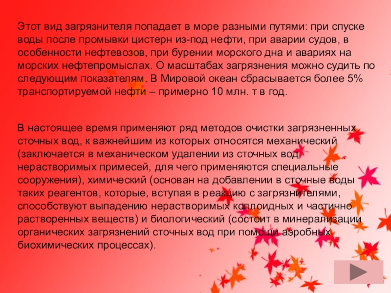 Этот вид загрязнителя попадает в море разными путями: при спуске воды после промывки цистерн из-под нефти, при аварии судов, в особенности нефтевозов, при бурении морского дна и авариях на морских нефтепромыслах. О масштабах загрязнения можно судить по следующим показателям. В Мировой океан сбрасывается более 5% транспортируемой нефти – примерно 10 млн. т в год.