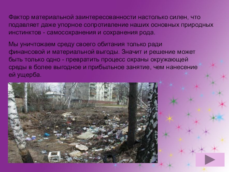 Мы уничтожаем среду своего обитания только ради финансовой и материальной выгоды. Значит и решение может быть только одно - превратить процесс охраны окружающей среды в более выгодное и прибыльное занятие, чем нанесение ей ущерба.