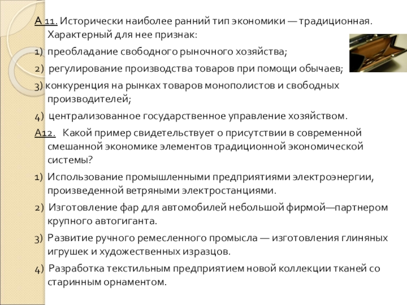 А12. Какой пример свидетельствует о присутствии в современной смешанной экономике элементов традиционной экономической системы?