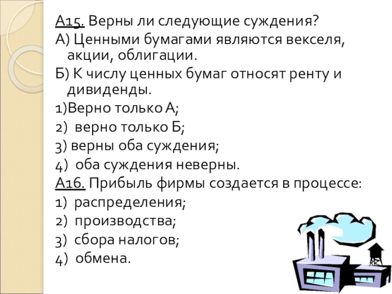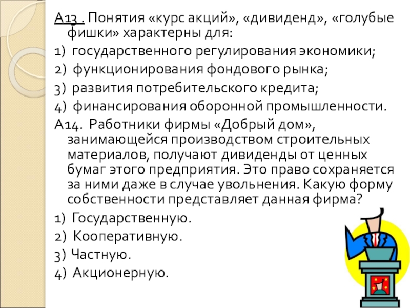 А14. Работники фирмы «Добрый дом», занимающейся производством строительных материалов, получают дивиденды от ценных бумаг этого предприятия. Это право сохраняется за ними даже в случае увольнения. Какую форму собственности представляет данная фирма?