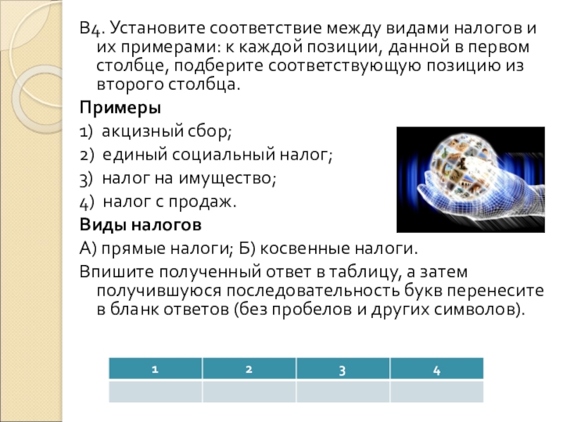 В4. Установите соответствие между видами налогов и их примерами: к каждой