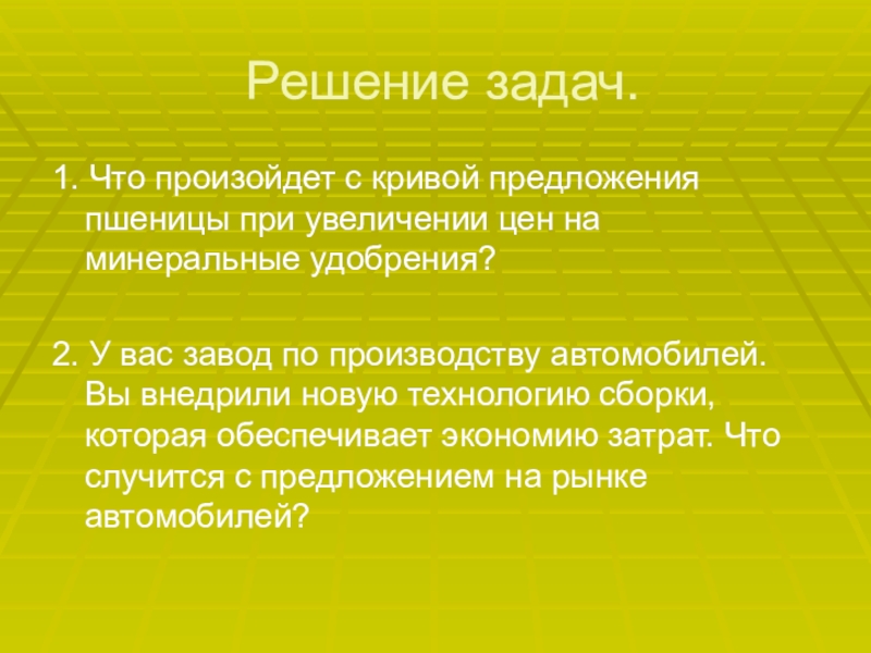 Решение задач.1. Что произойдет с кривой предложения пшеницы при увеличении цен на минеральные удобрения?2. У вас завод
