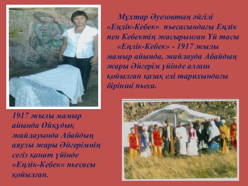 1917 жылы мамыр айында Ойқұдық жайлауында Абайдың аяулы жары Әйгерімнің сегіз қанат үйінде «Еңлік-Кебек» пьесасы қойылған.
