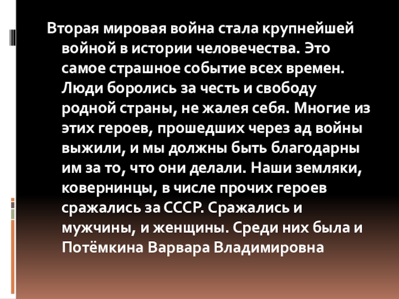 страшное событие всех времен. Люди боролись за честь и свободу родной страны, не жалея себя. Многие из этих героев, прошедших через ад войны выжили, и мы должны быть благодарны им за то, что они делали. Наши земляки, ковернинцы, в числе прочих героев сражались за СССР. Сражались и мужчины, и женщины. Среди них была и Потёмкина Варвара Владимировна