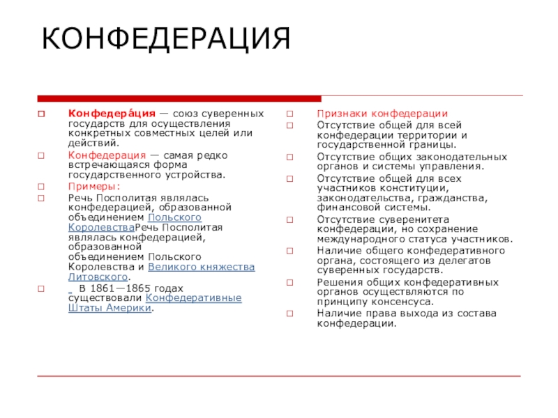 Отсутствие суверенитета конфедерации, но сохранение международного статуса участников.