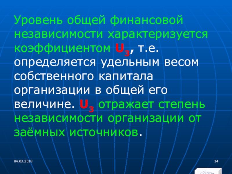 Слайд 14Уровень общей финансовой независимости характеризуется коэффициентом U3, т.е. определяется удельным весом