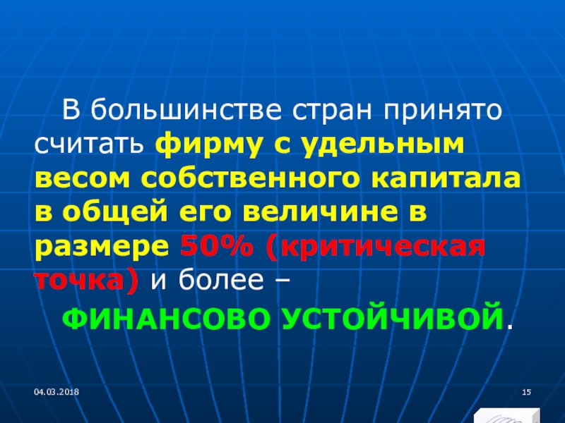 Слайд 15В большинстве стран принято считать фирму с удельным весом собственного капитала