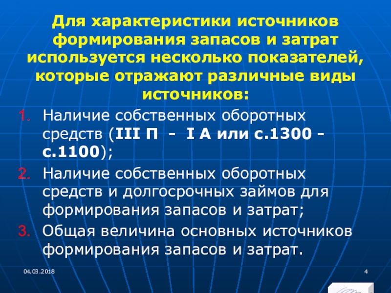 Слайд 4Для характеристики источников формирования запасов и затрат используется несколько показателей, которые