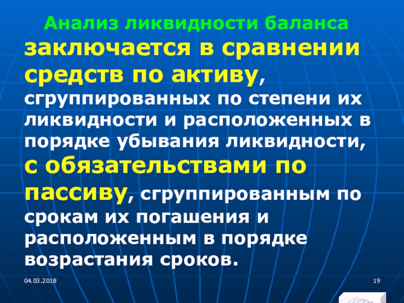 Слайд 19Анализ ликвидности баланса заключается в сравнении средств по активу, сгруппированных по