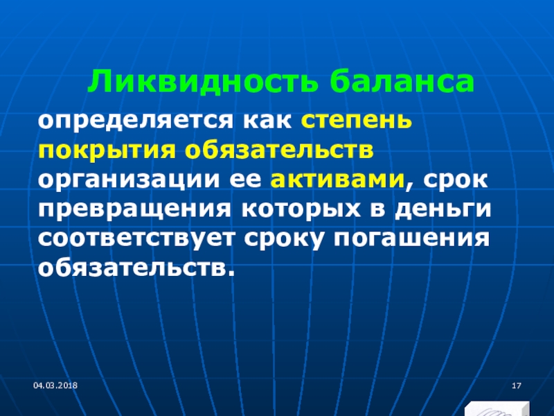 Слайд 18От ликвидности баланса следует отличать ликвидность активов, которая определяется как величина,