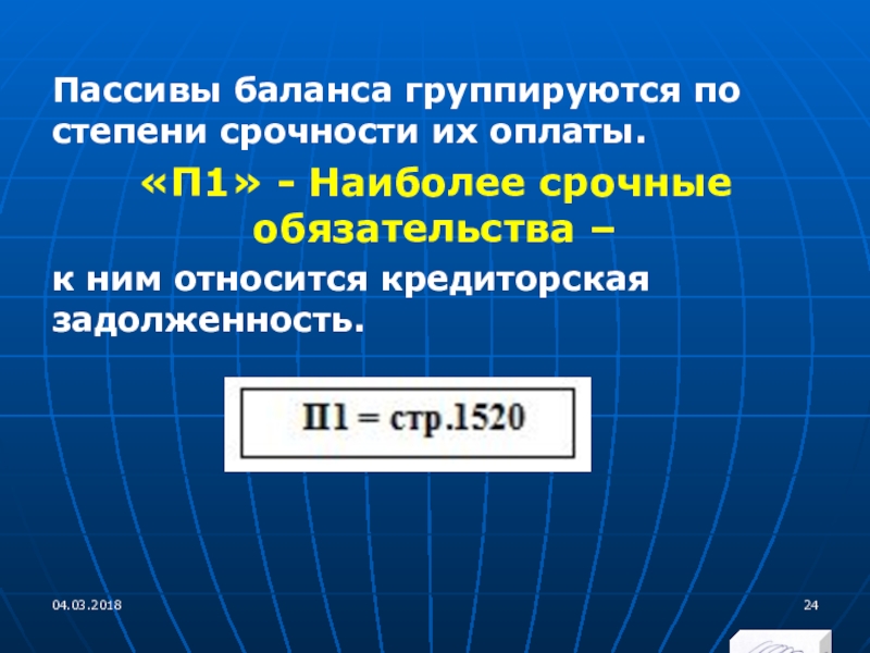 Слайд 24Пассивы баланса группируются по степени срочности их оплаты.
