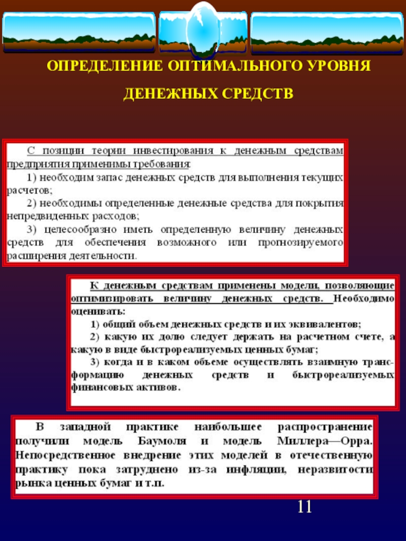 Денежные средства (ДС) часто именуются неприбыльными активами и они необходимы для поддержки текущей платежеспособности предприятия. Целью управления ДС является поддержка их на минимально допустимом уровне, достаточном для осуществления нормальной деятельности предприятия.