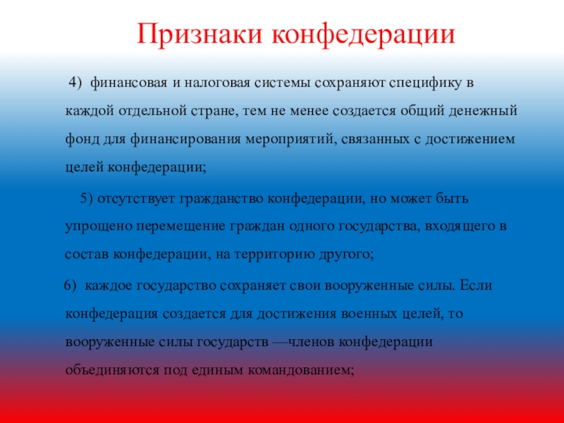 6) каждое государство сохраняет свои вооруженные силы. Если конфедерация создается для достижения военных целей, то вооруженные силы государств —членов конфедерации объединяются под единым командованием;