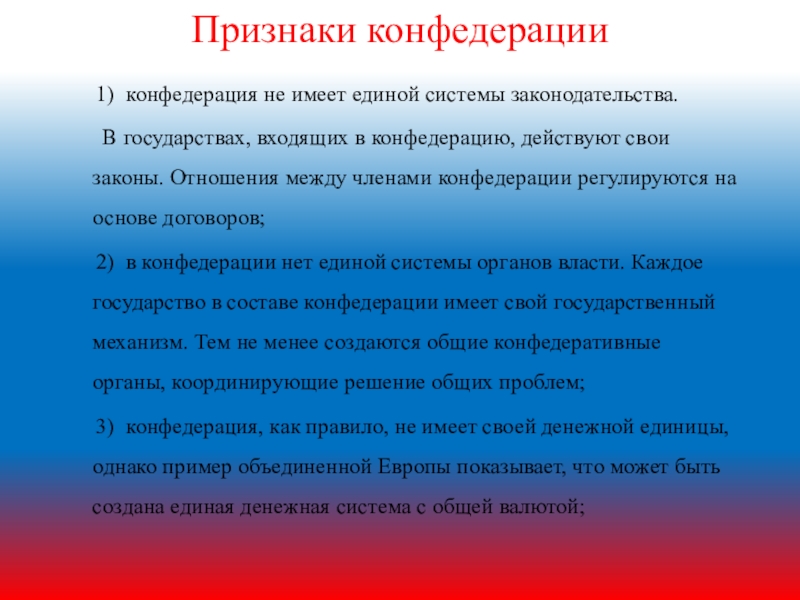 2) в конфедерации нет единой системы органов власти. Каждое государство в составе конфедерации имеет свой государственный механизм. Тем не менее создаются общие конфедеративные органы, координирующие решение общих проблем;