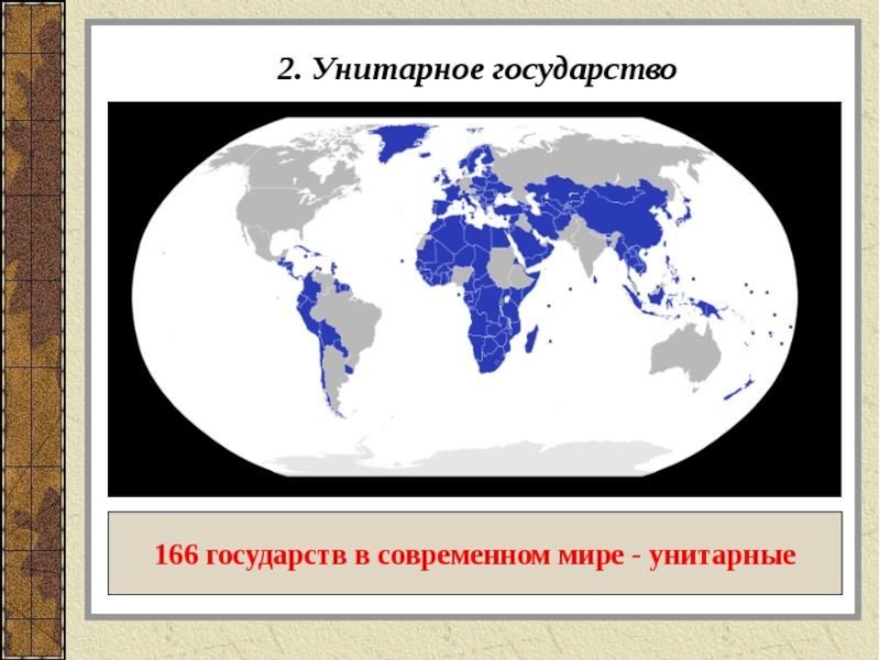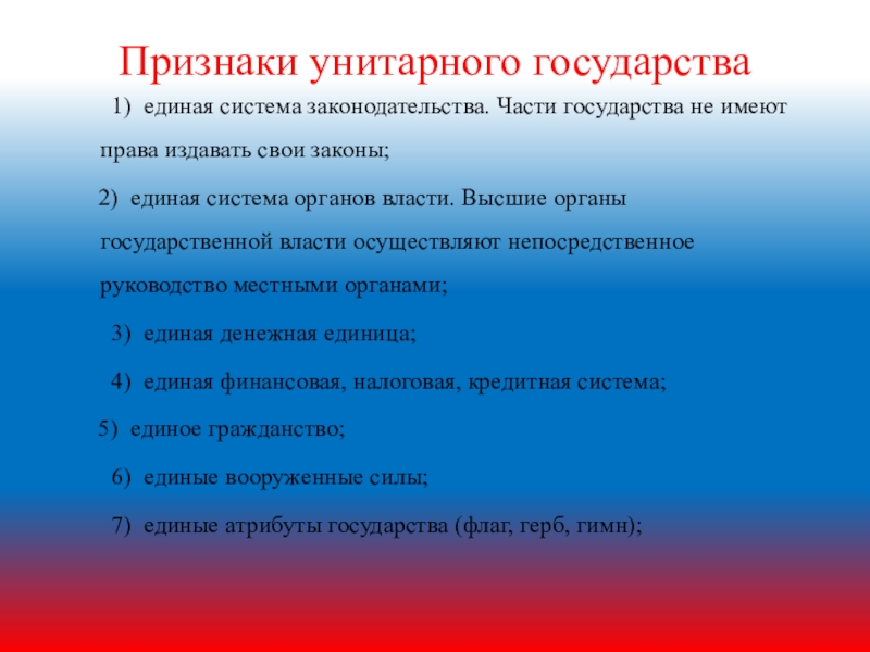 Унитарное государство – (от лат. unitas - единство) это целостное государство, административно-территориальные единицы которого не обладают признаками суверенитета.